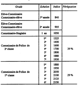 - Le grade de commissaire de Police de 2ème classe, qui correspond au grade de capitaine de l’Armée, comporte sept échelons ;