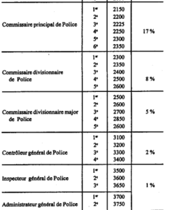 - Le grade de commissaire de Police de 1ère classe, qui correspond au grade de commandant de l’Armée, comporte six échelons ;